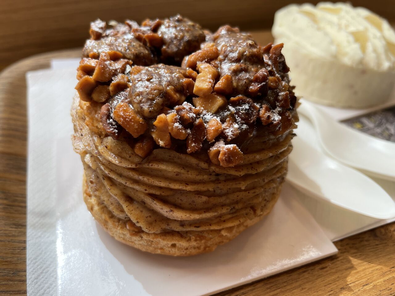 上に乗ったナッツとクリームの風味がとてもよく合い、甘ずぎることもなく最後まで美味しく食べられます。シュー生地のさくさくとナッツのカリカリ、クリームのふわふわなど、食感も楽しいパリブレストでした!