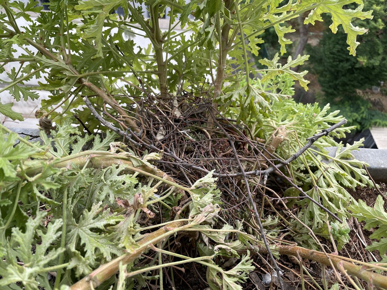 「最近よく来るねー」なんて言ってたら大きく育ったゼラニウムの根元に巣を作り始めたので、二人で暖かく見守ってました。