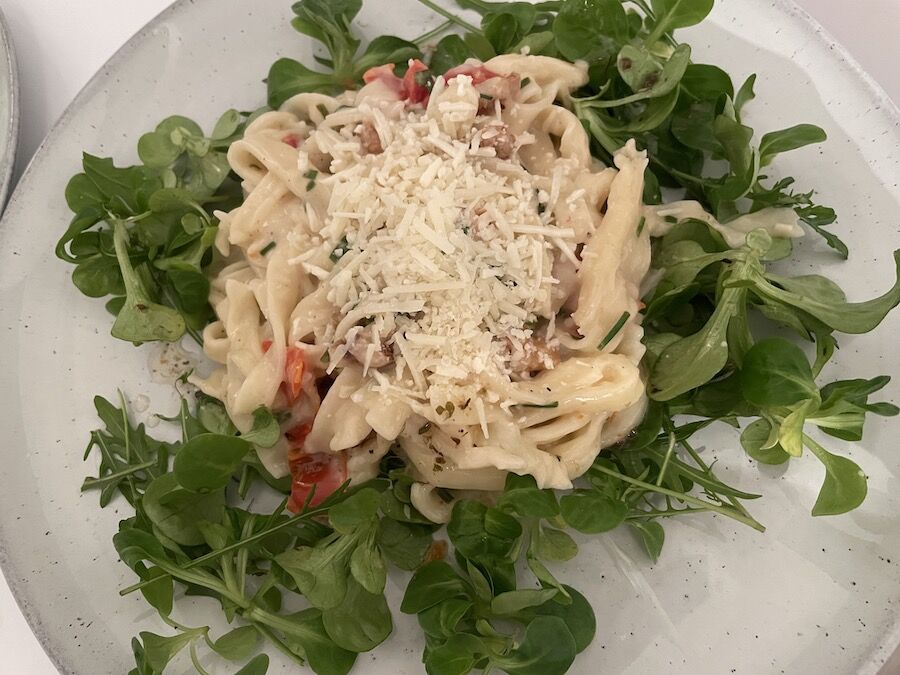 お次は「タリアテッレ、ペコリーノクリーム、クルミ」。なんで単語並べるの。