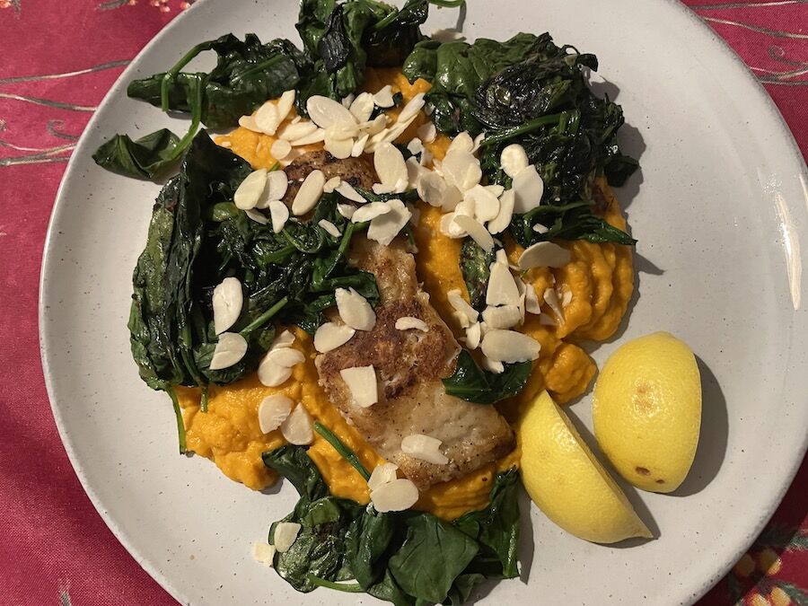 せっかくなので「ムニエルとしおれたほうれん草を添えて」を作ってみます。しおれたって...