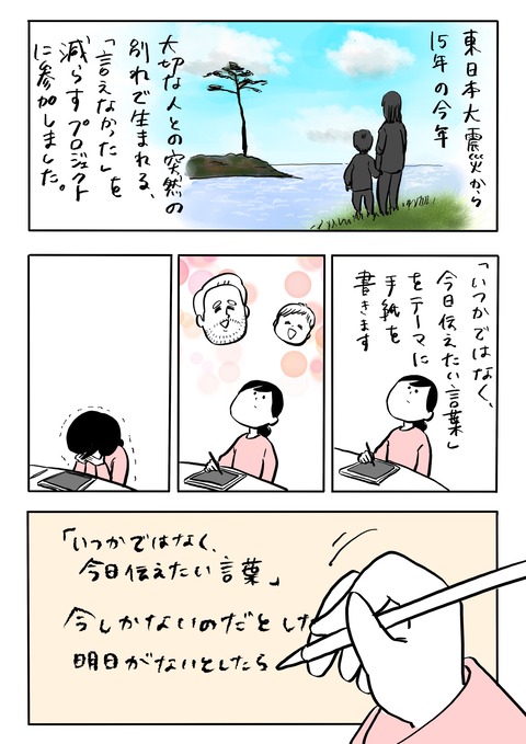 「いつかではなく、今日伝えたい言葉」 2011年3月11日、「いつか」が来ないこともあると私たちは知りました。 あれから15年。 「いつかではなく、今日伝えたい言葉」をテーマに大切な人へ宛てた手紙を書く企画に参加させていただきました。 さまざまな方がお手紙を書いています。大切な人に向けた言葉を綴った手紙 ... 続きを読む 2026年03月11日