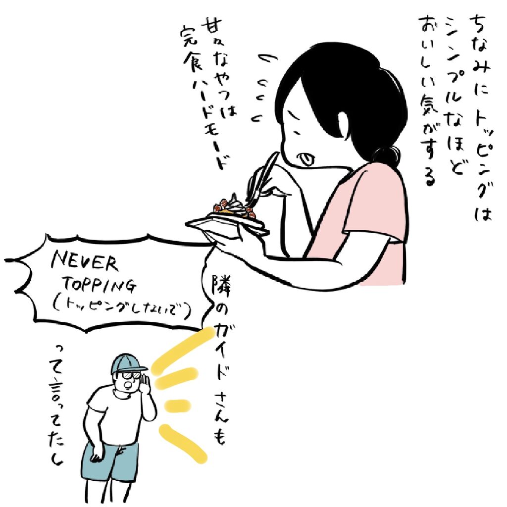 生地だけだったらもっと美味しかったはず。隣のガイドさんのネバートッピングを聞いときゃよかったと後悔です。