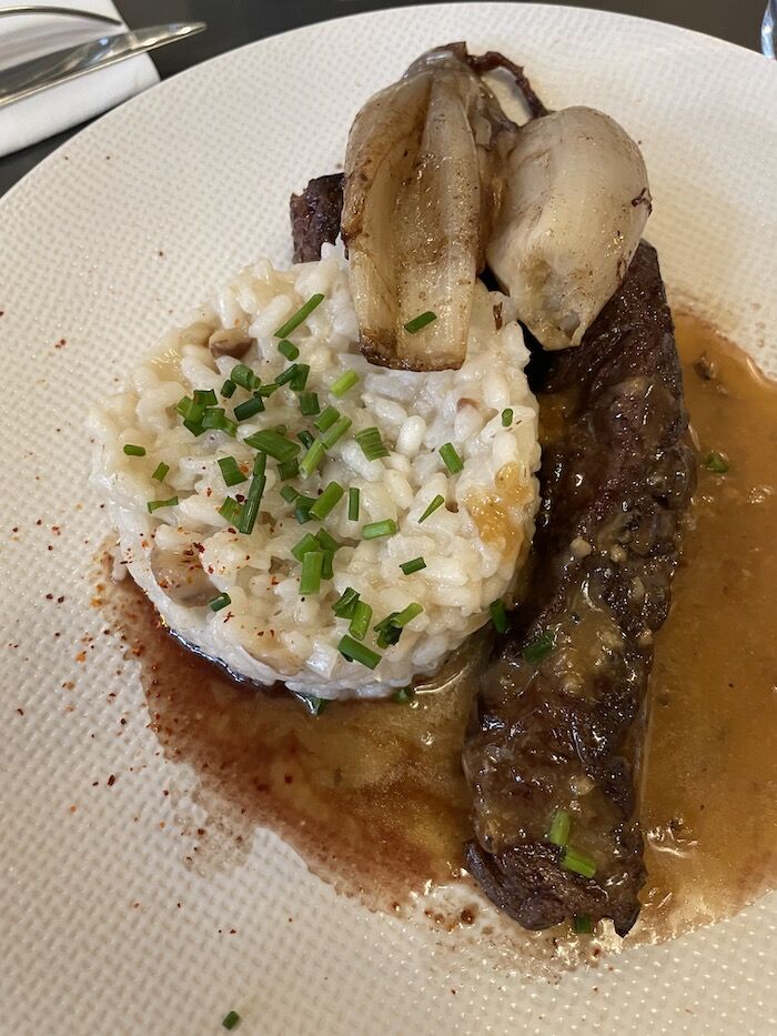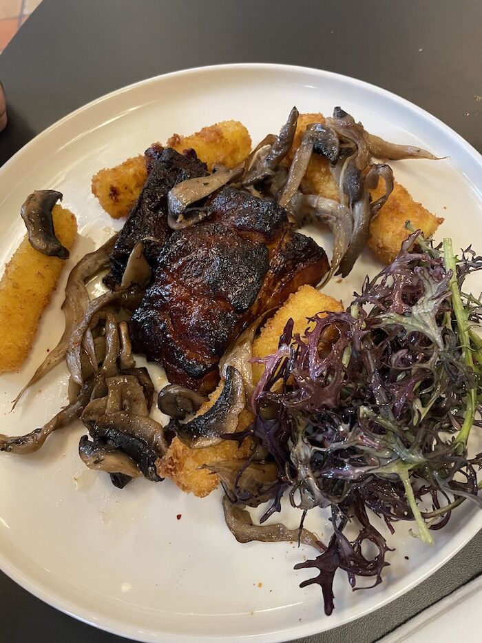 ぶよぶよしがちな脂身がとても美味しくなってて、表面はパリッと肉はジューシーで全然くどくない仕上がり。フランスで食べた豚肉の中で一番おいしかったです。思わず「シェフを呼んでくれ」って言いそうになりましたが、グッと堪えました。
