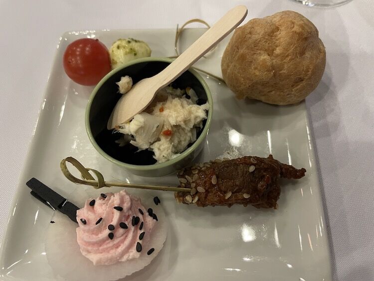 キノコスープはありませんでしたが、この小さなホタテサラダ?と千枚漬けの上のタラマ?と牛肉の串とかの初めて見るものたちがとにかく美味しくて!