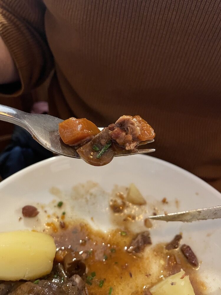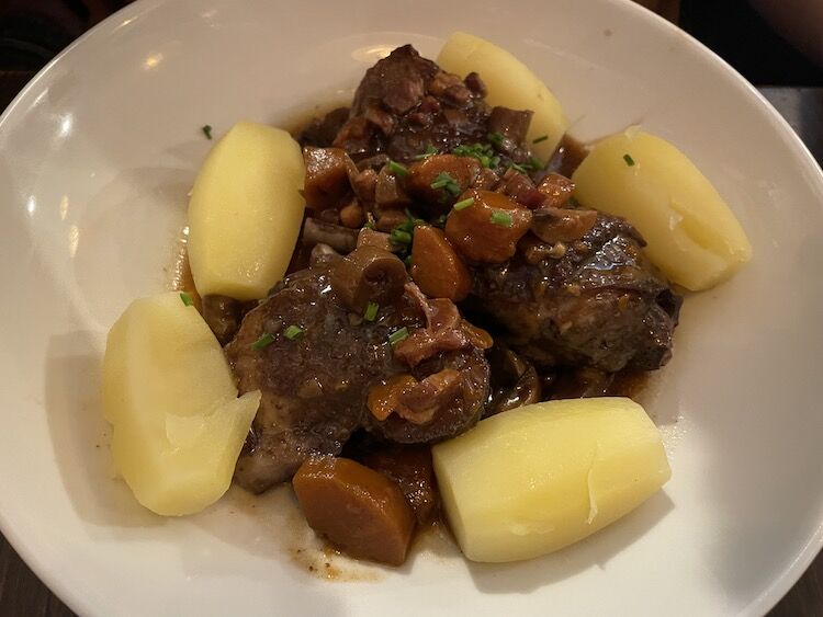 私たちが注文したのはcoq au vin(雄鶏の赤ワイン煮込み料理)と