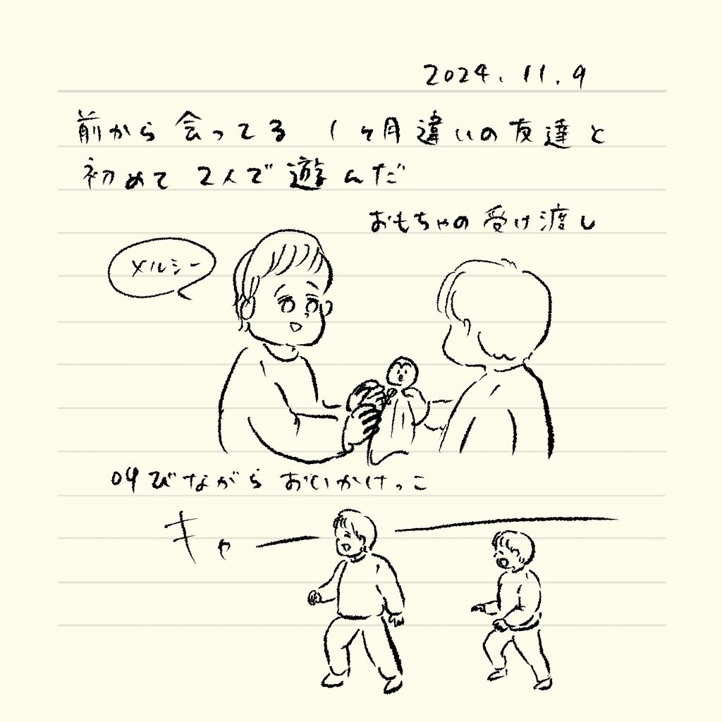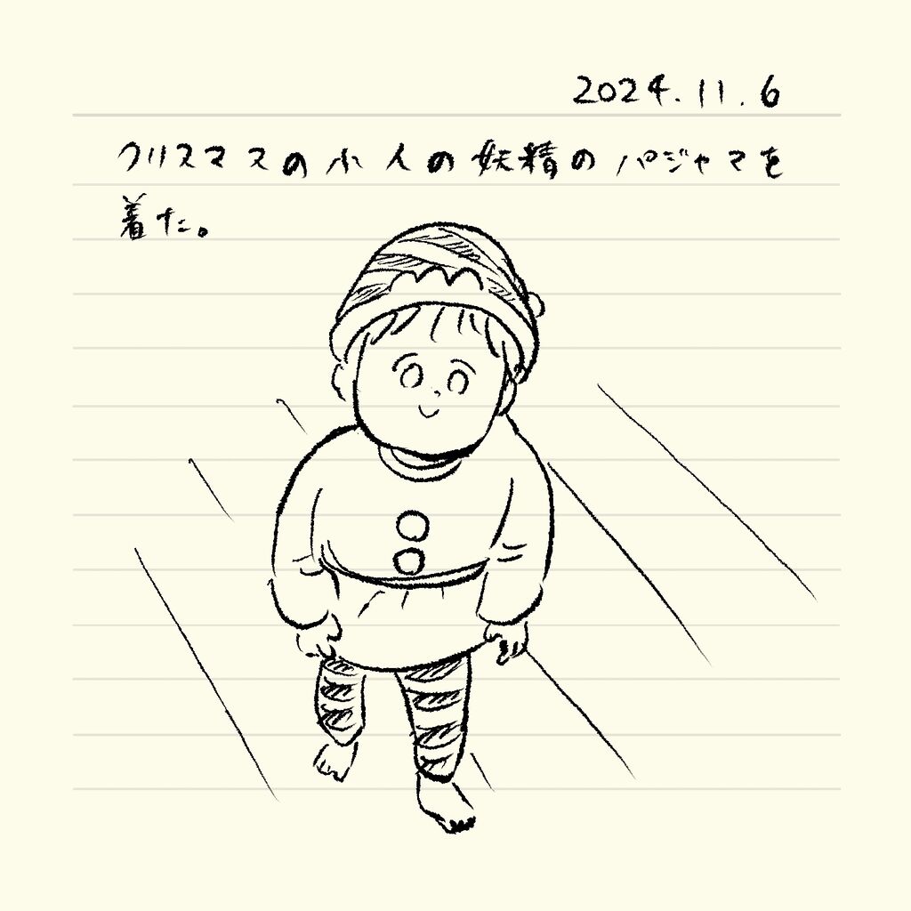 べべダモ日記52 2024年11月17日 廊下を走るのが楽しいらしく、「ヨーイ、ドン」にハマってます。「ヨーイ、ドン」の構えをしてから走ると何故か腕が自然に動かなくなりますが、それも楽しい様子。でも一緒に走らなければならないのがめんどくさい。クリスマス用に買ったサンタの家で働く小人のパジャマはかわいすぎました。家の中にちょこちょこ動く小さな小人がいるのがたまりません。先週のべべダモ日記はこちら 最初から読むKindleでのまとめ読みはこちらからべべダモ日記(1歳半〜2歳)しばひろ2024-09-11過去作無料一気読み! ガイックと暮らすフランスの1ページ ヒロコ Kindle本 全6冊単行本発売中!うちのガイックさんヒロコブティック社2021-07-09ガイックとのフランス暮らしヒロコKADOKAWA2023-06-12 「べべダモ日記」カテゴリの最新記事 < 前の記事次の記事 > コメント コメント一覧 (2) 1. BB 2024年11月18日 09:25 まあなんて可愛い💕💕 天使のようですね❣️ 可愛い過ぎて、ため息が漏れてしまいました。 毎日こんな可愛い天使と暮らせるなんて、なんて贅沢❣️ また可愛い写真お待ちしています🥰 2. よう 2024年11月18日 21:49 いつも楽しく読ませてもらってます。ベベダモちゃん、なんてカワイイの!!ほんと天使ちゃんですね!私の年齢はベベダモちゃんが孫といっていいほどなのですが、我が子は誰も結婚しません。これからも、更新を楽しみにしてます!! コメントフォーム 名前 コメント 評価する リセット リセット 顔 星 投稿する 情報を記憶