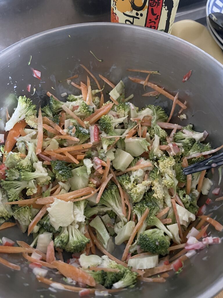 これはブロッコリーとにんじんとカニカマにマヨネーズとポン酢を合わせたもの。