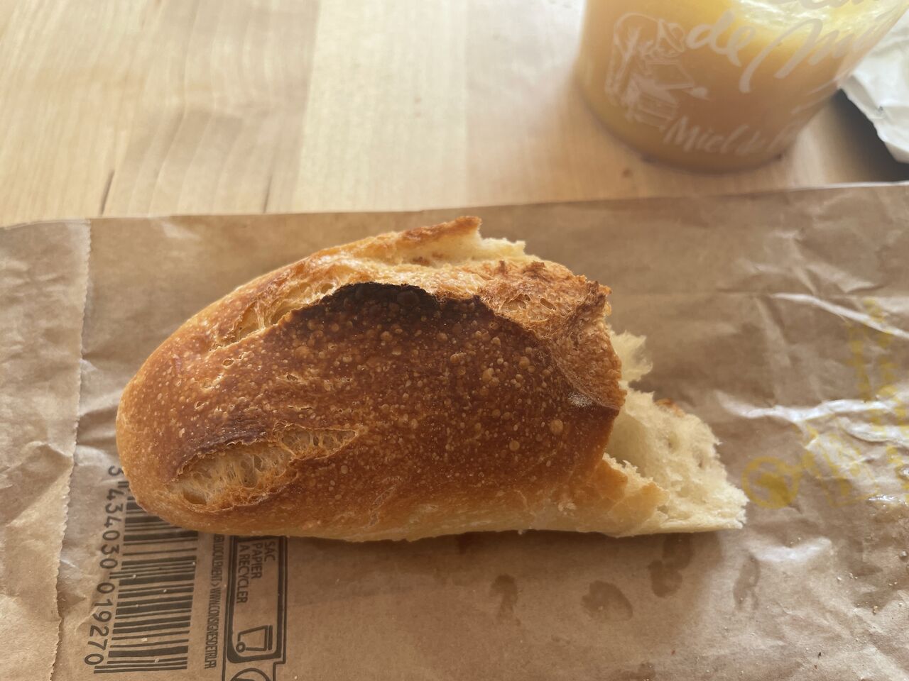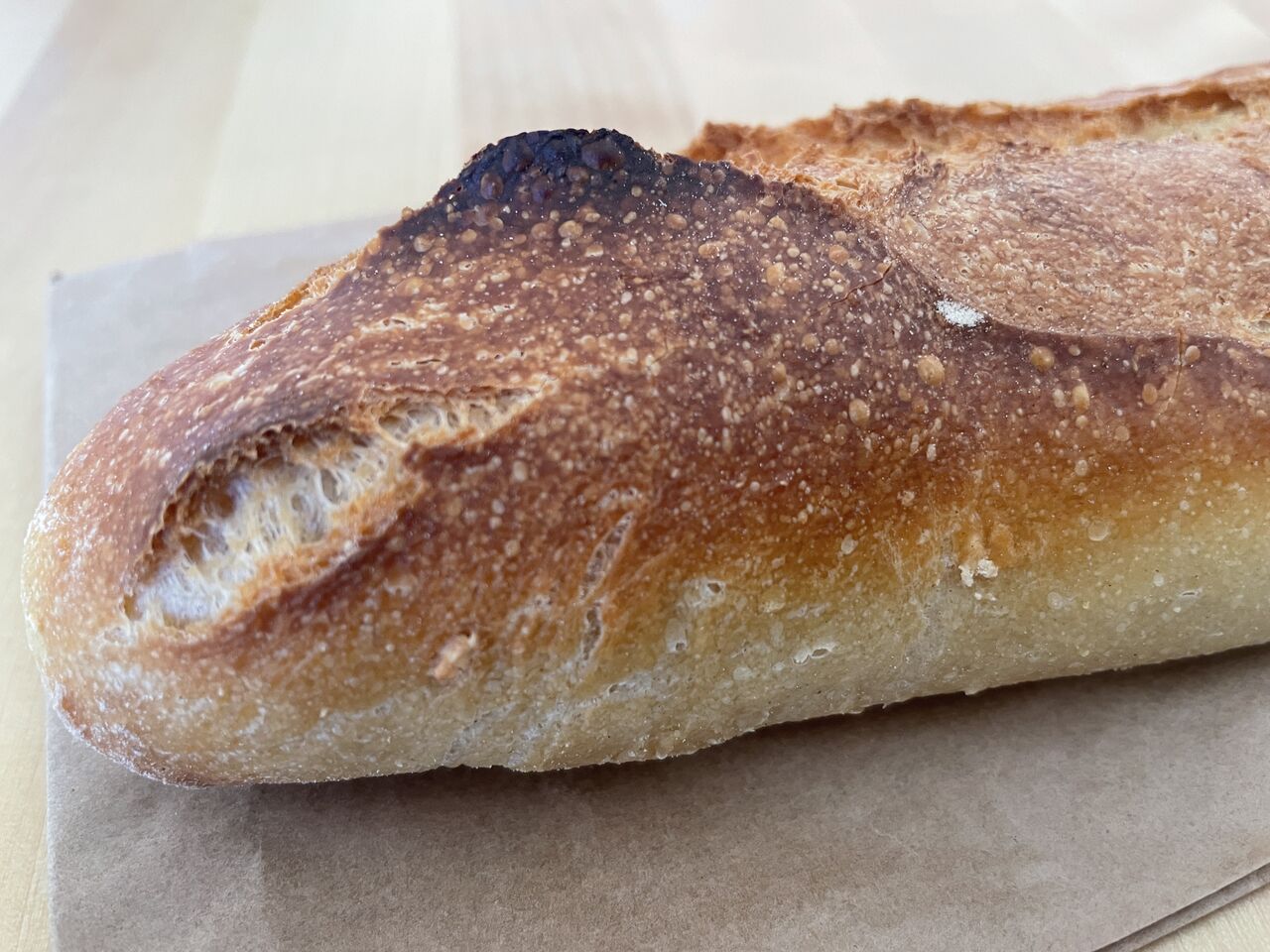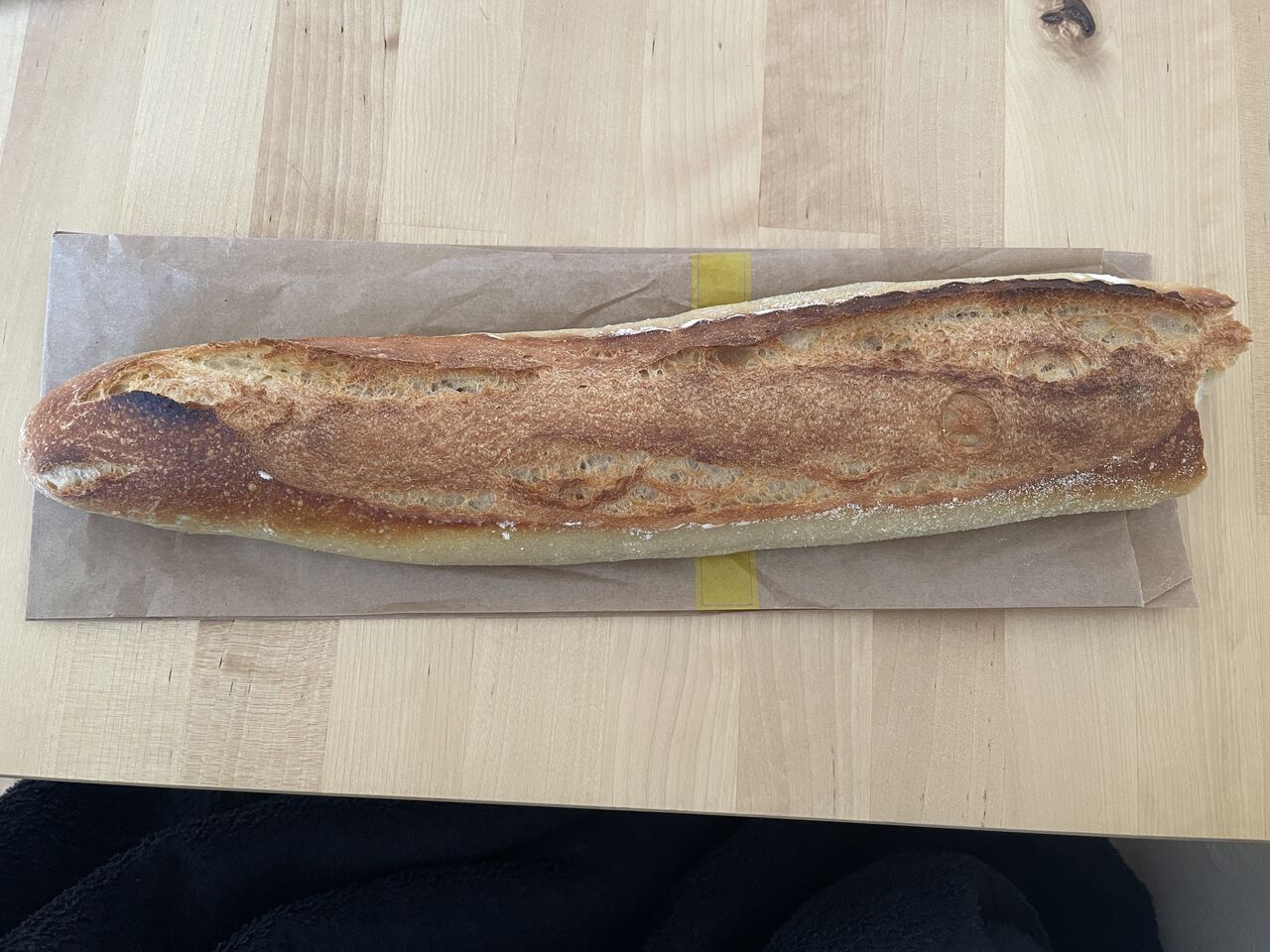 焼きたてのバゲットの先端はカリフワでおいしいので、買ったらすぐにかじります。