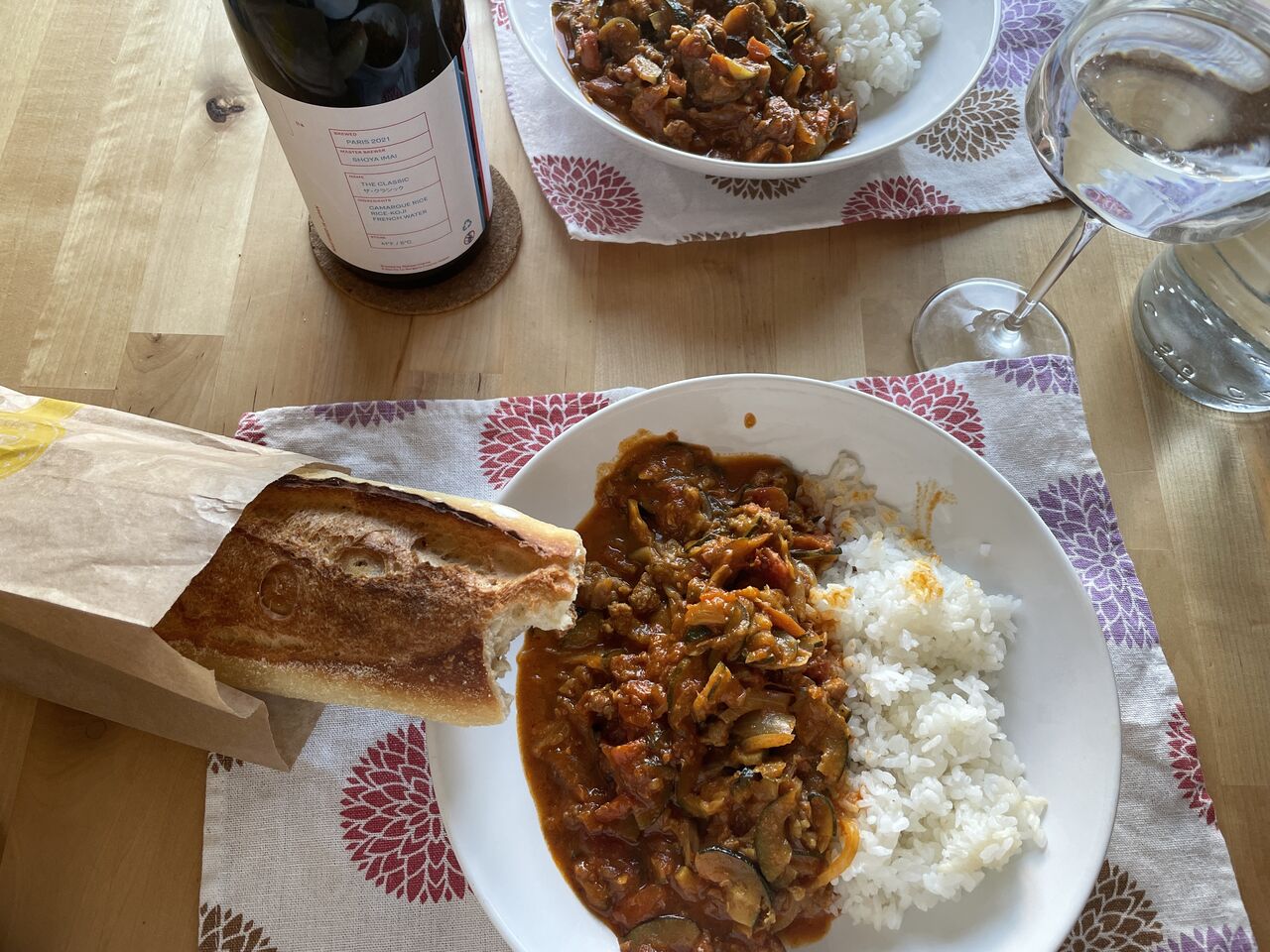 カレーのご飯を少なめに盛って、余ったルーをバゲットにつけて食べます。